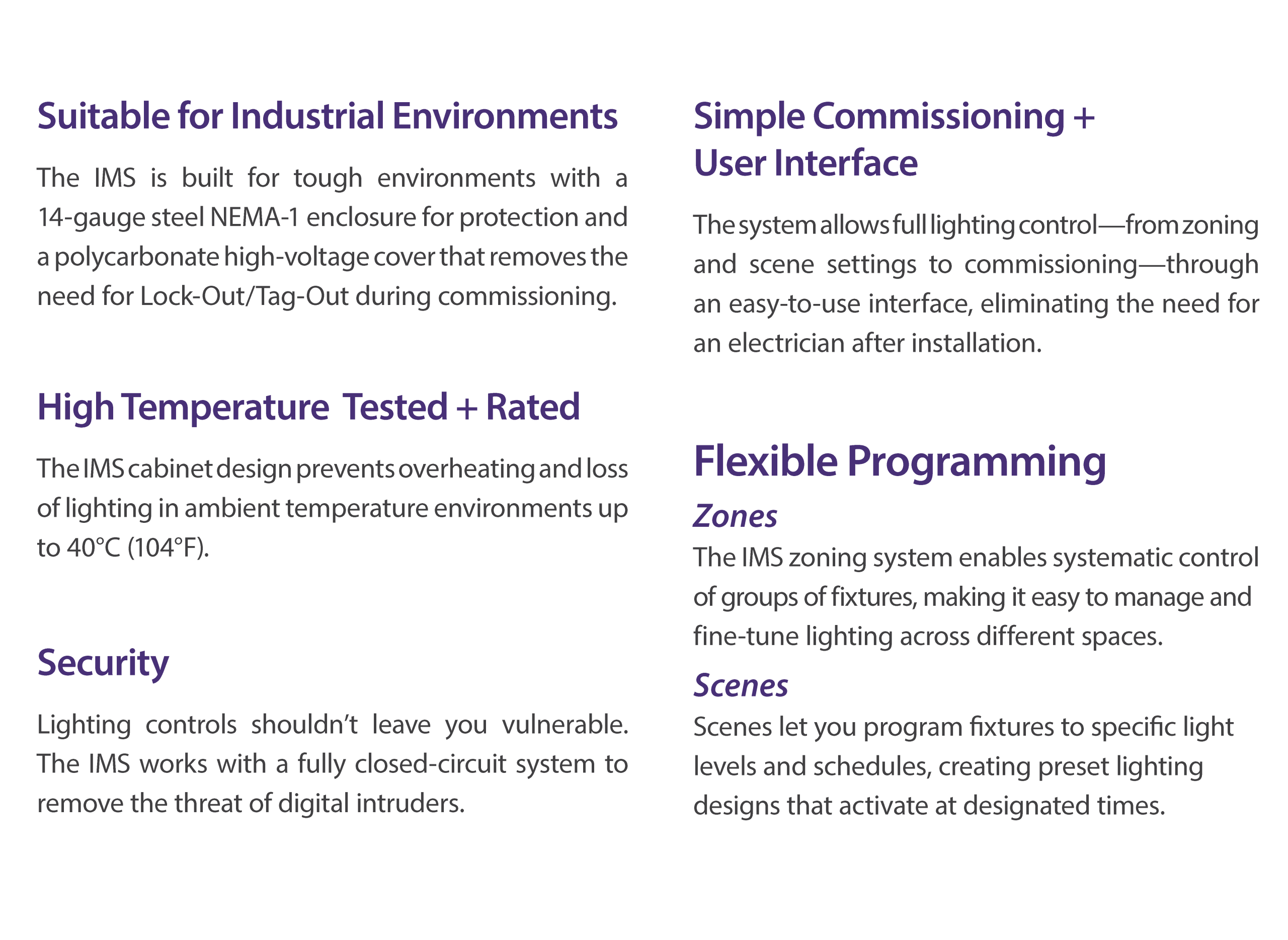 NICOR’s Illumination Management System (IMS) introduces simple installation with an easy-to-use user interface. The Digital Addressable Lighting Interface (DALI) enabled system provides individual fixture control to multi-site empowerment with our Master Control Unit (MCU). Developed with energy management in mind, this system is perfect for industrial facilities, data centers, and large commercial buildings.