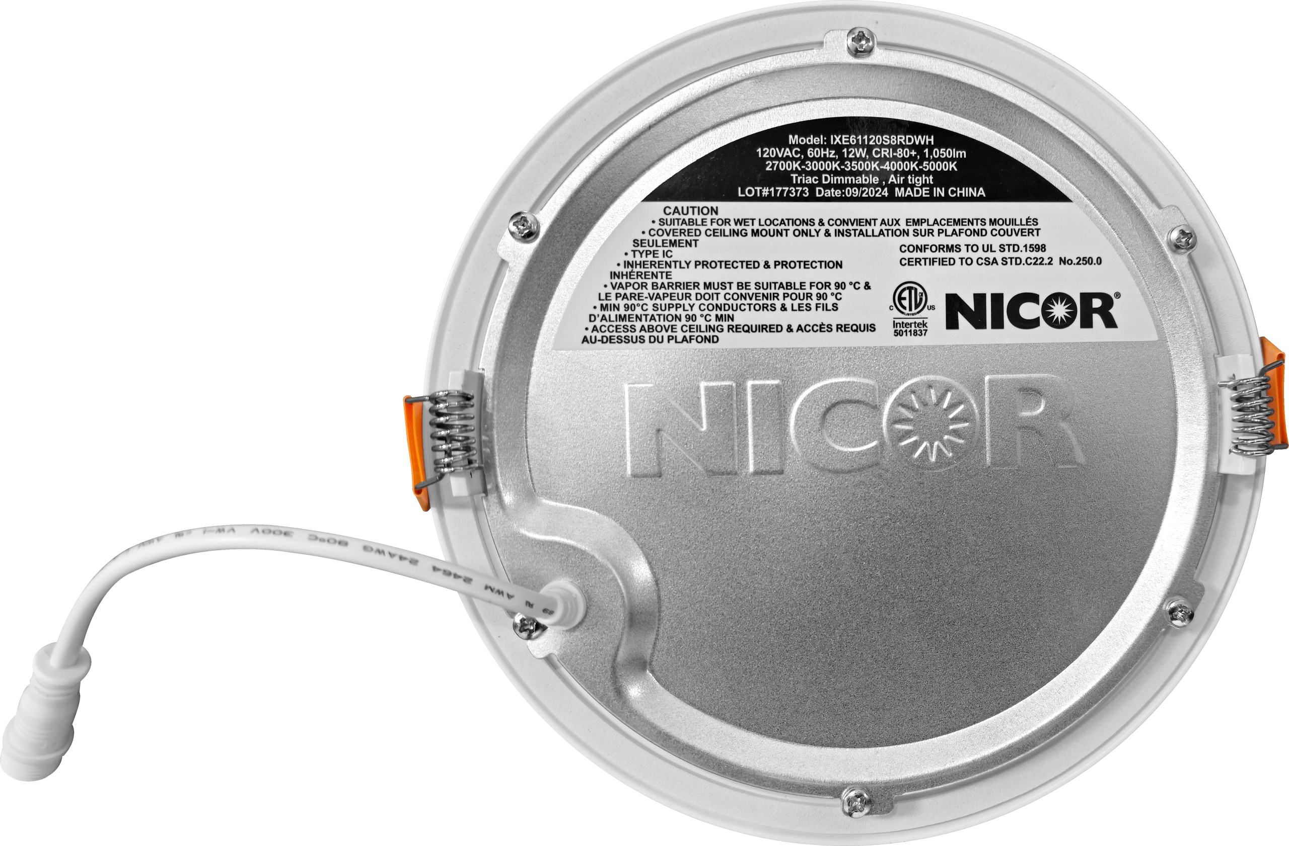 The IXE 6-inch Canless LED Downlight presents a clean and attractive low-profile design that’s incredibly easy to install. The IXE features Selectable color temperatures at 2700K, 3000K, 3500K, 4000K, and 5000K for true customized lighting in any room. The edge-lit technology provides consistent lighting with an extremely thin fixture depth at just 0.38”. The separate, off-board driver/junction box and spring-loaded retention tabs allow faster and easier installation eliminating the need for a recessed housing. A plenum-rated cable links the downlight to the remote driver, keeping heat away from vital components for an increased product lifespan. The IXE is Insulation Contact rated (IC-rated), Airtight, Wet-Location rated, and protected by NICOR’s 5-Year Limited Warranty. Available in 12-packs, delivered ready to install and use right out of the box. No other parts or components required.